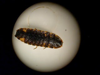 Larva de Lampyris raymondi (segundo a opinião de alguns investigadores). Em relação à Lampyris iberica e Lampyris noctiluca, apresenta dois pontos claros extra no pronoto, na parte frontal. Autor Hectonichus.